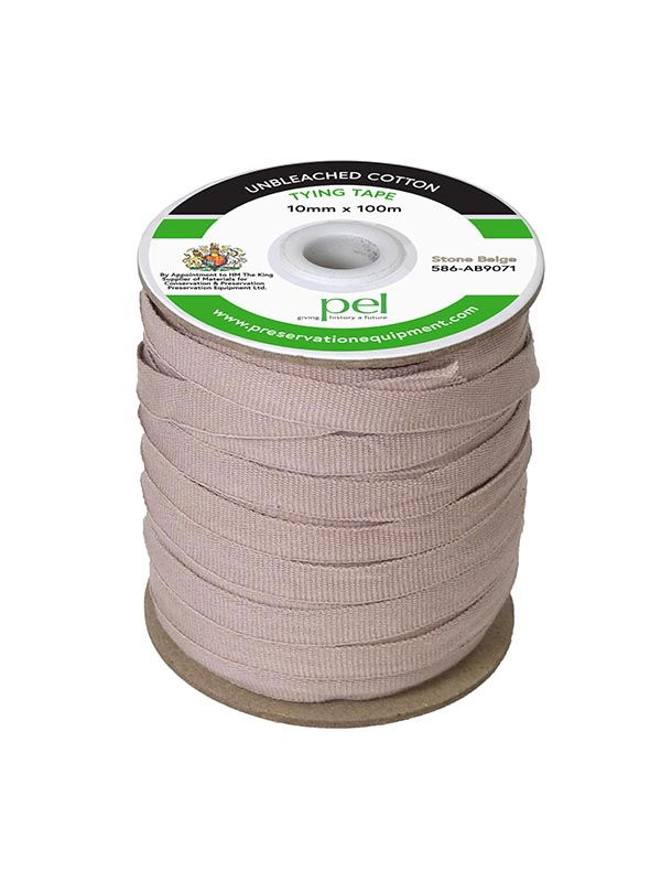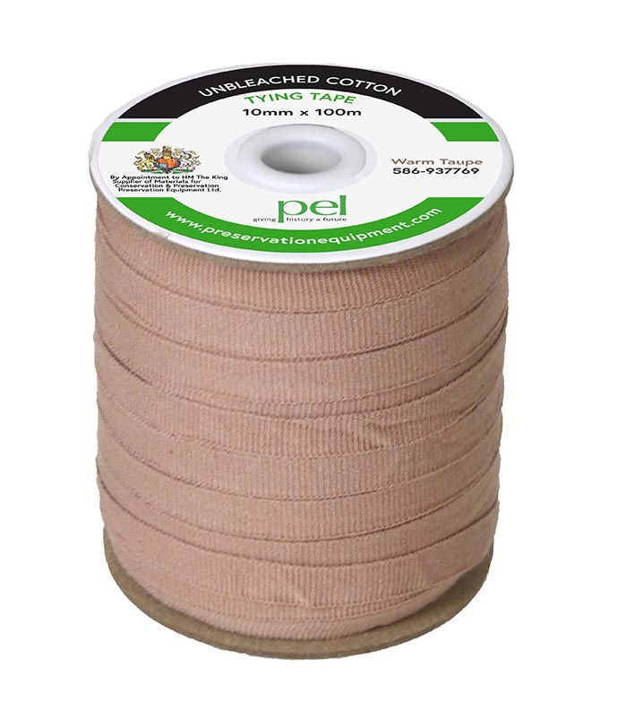 Brown toned cotton tying tapes, unbleached acid-free, archival quality. The tying tape is 100% cotton and toned to blend more naturally with aged bindings, papers, boards, leather, wood and more when placed on shelf or on display.