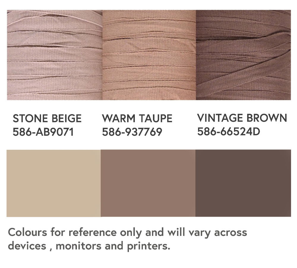 The soft 10mm wide cotton tape is available in 3 different tones, Stone Beige (lightest), Warm Taupe and Vintage Brown (darkest). Colours will not bleed.