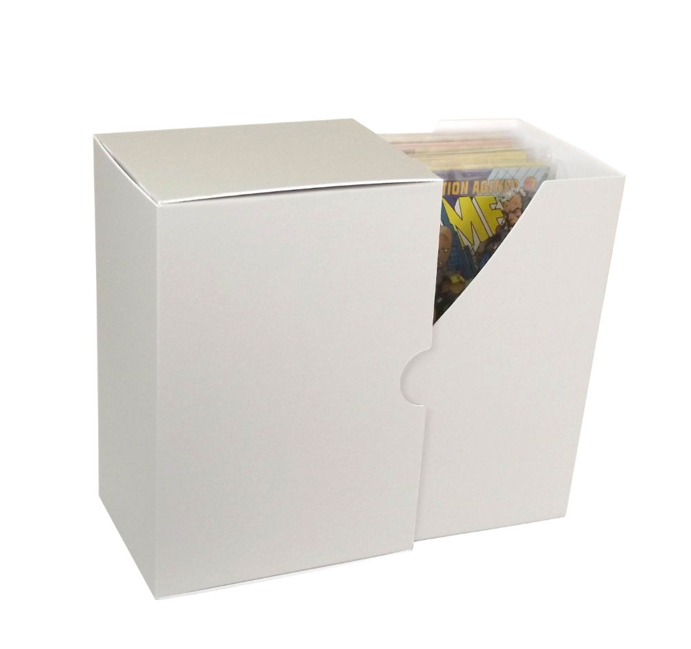 Comic book short boxes, for archival and acid free storage on shelving with slipcase. The inner storage box allows simple browsing without needing to remove comics, the outer slipcase offers protection from dust and fading. The buffered box material prevents damage caused by migrant acidity from other items on the shelf, or the shelf itself.