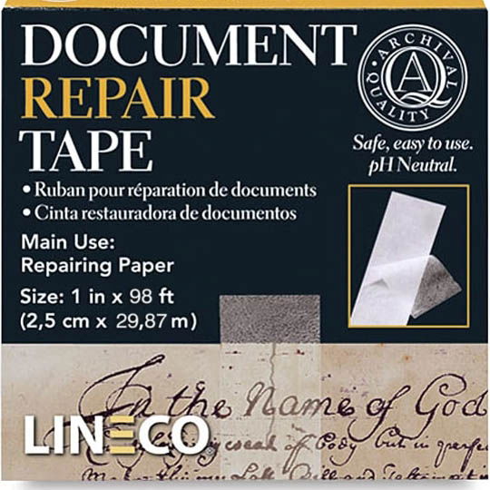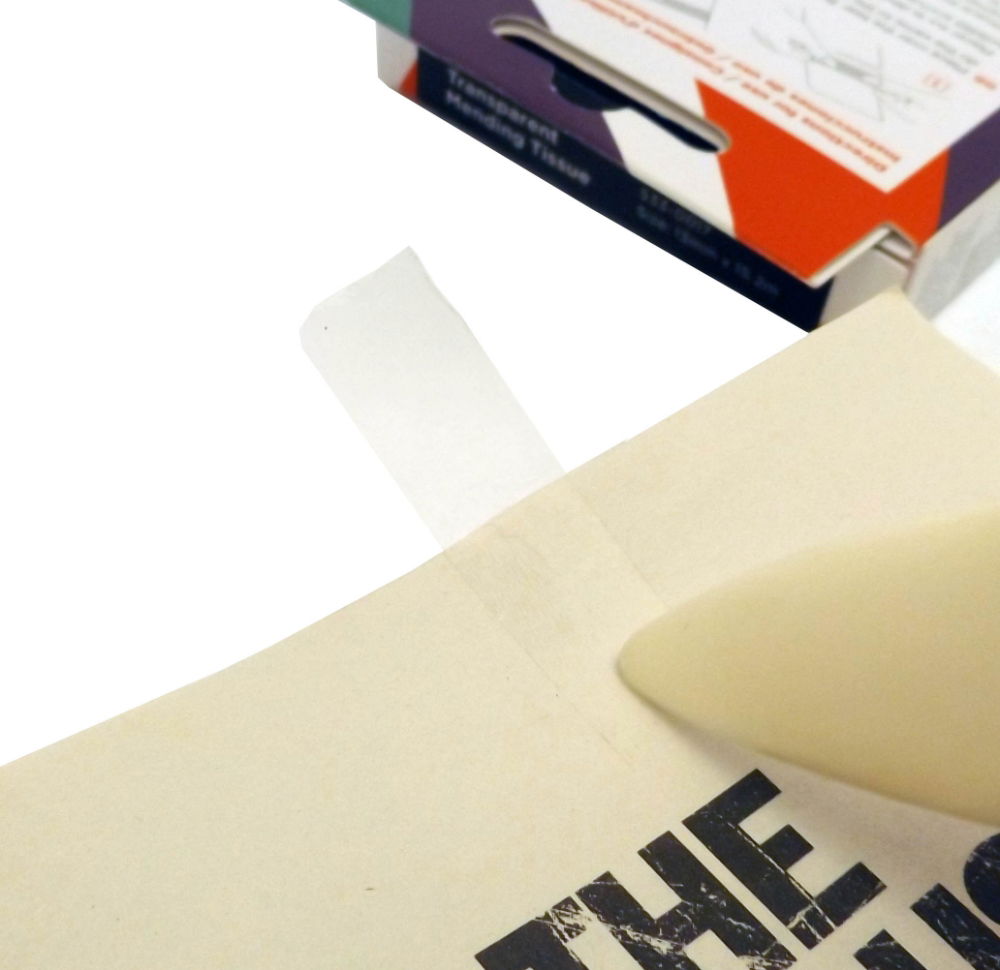 Document repair tape - Strong, acid-free non-yellowing, transparent tissue paper. Archival and conservation quality, used by Archives, Libraries and Museums worldwide. Same as the Transparent Mending Tissue but 25mm wide for larger repairs. It has been thoroughly tested and approved by numerous government agencies and is a favourite of both conservators and collectors. Easy to use, gently clean the document removing surface dirt to ensure good adhesion, place over tear and burnish with bone folder.