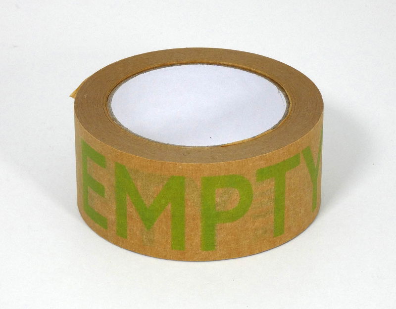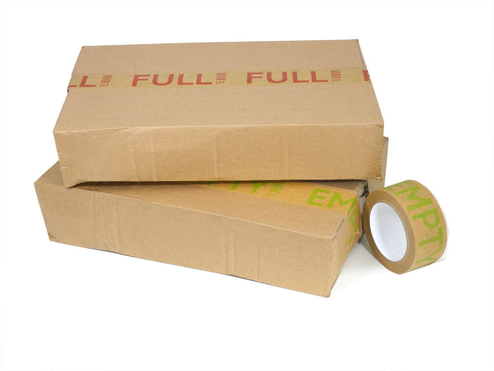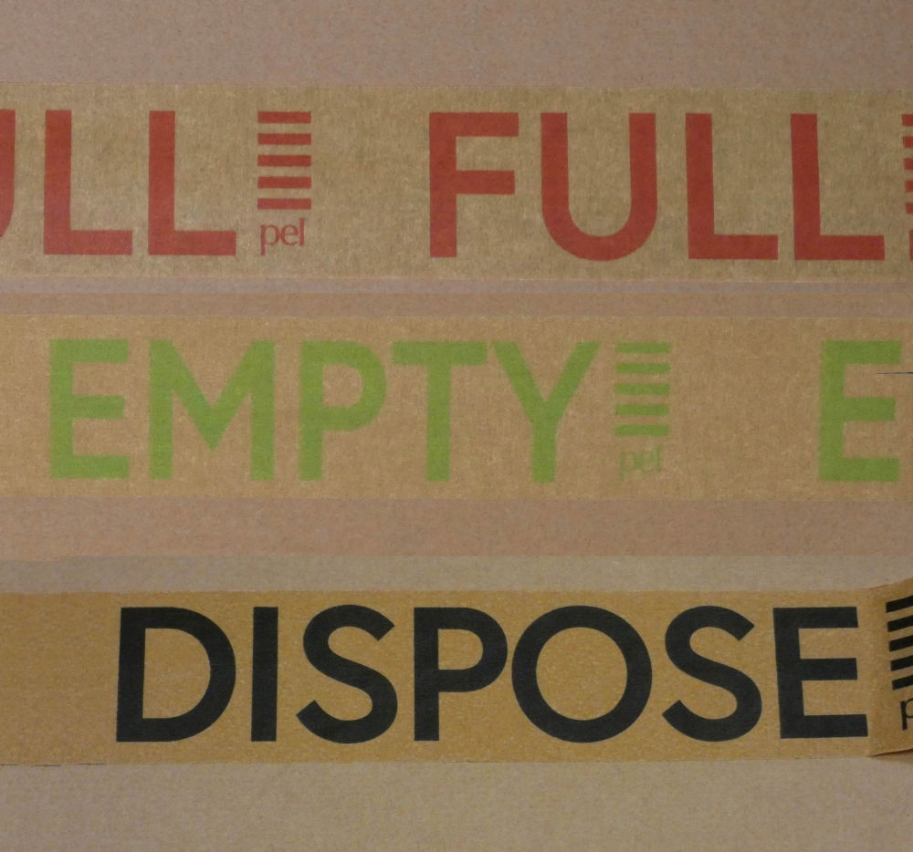 Packing tapes with 'Empty' (Green), 'Full' (Red) and 'Dispose' (black) printed on them for easy identification of packed boxes. This tape is printed on a paper backing and is recyclable.
