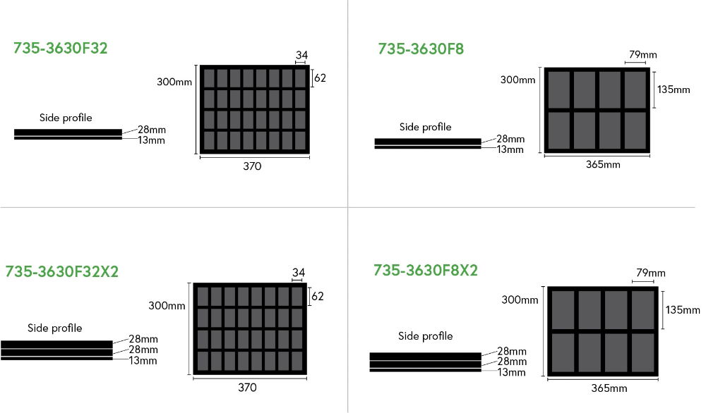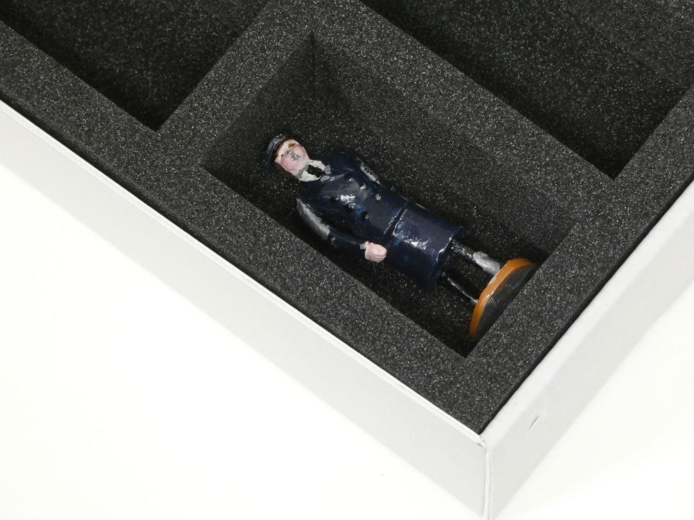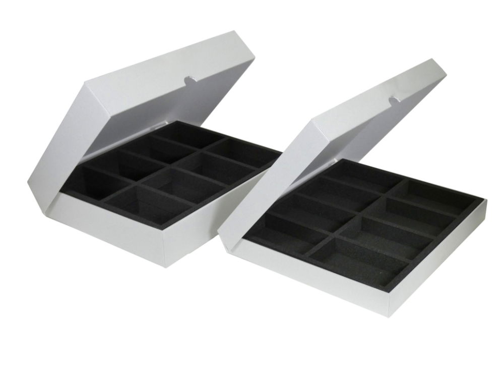 Archival grade Plastazote LD45 foam is layered with a 12mm base layer, deeper boxes have two stacked layers 56mm deep, shallow box compartments are 28mm deep.