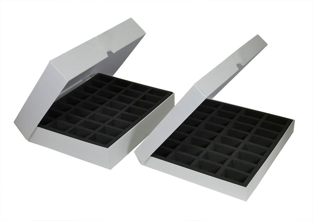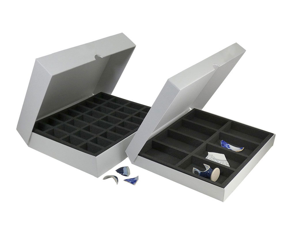 Boxes with foam inserts for long term storage, the cut Plastazote foam inserts are completely acid free and inert and ideal for storage of of smaller objects and fragments. The unbonded layered foam inserts can be removed to make it easy for placement and removal of objects. Suitable for long term storage or transportation purposes.