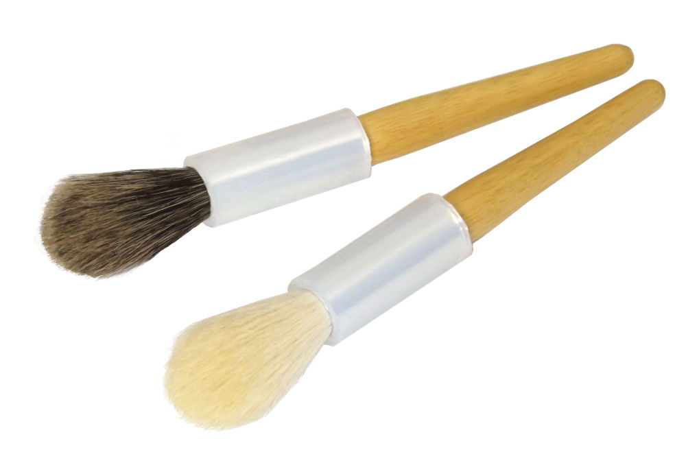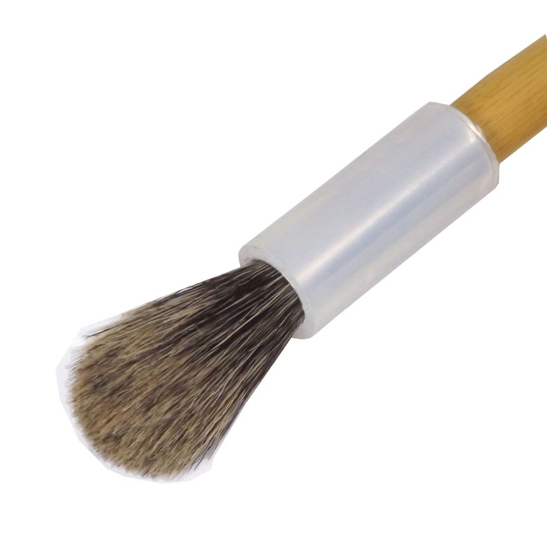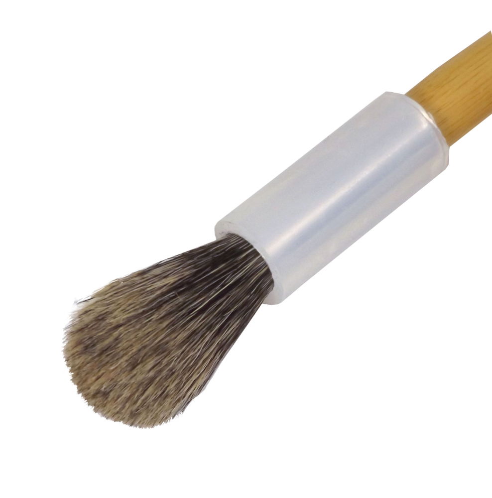 The brush’s short handle enables a closer working distance for delicate work. Badger hair, whilst very soft, is stiffer and has a natural spring which helps remove dust without excess movement of the brush. White goat hair is softer than badger hair and suited to very fragile surfaces.