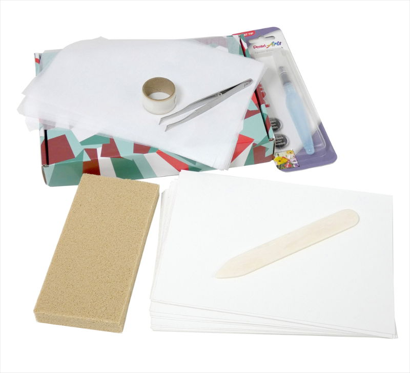 A complete application kit (682-35KIT) is available in 'Accessories to fit' below, containing; 1 x Tengu Gummed Tape Roll - , 1 x Dry Cleaning Sponge - 961-1002, 1 x Waterbrush, 1 x Curved Tweezers, 1 x Bone folder, 10 x A5 Blotting Paper Sheets, 10 x A5 Bondina (30gsm) Sheets, 1 x Step by step instruction sheet.