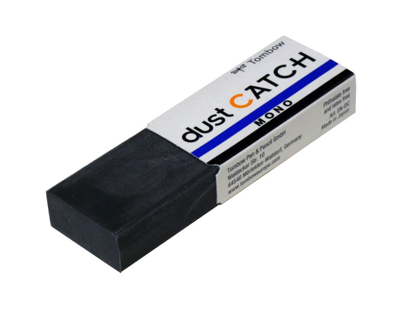 The Tombow dust catch eraser is ideal for removing marks from even the most heavily textured papers. The unique polymer formula means that the waste strands from the eraser are collected together. The black colour makes it easier to identify any remaining waste on light coloured media.